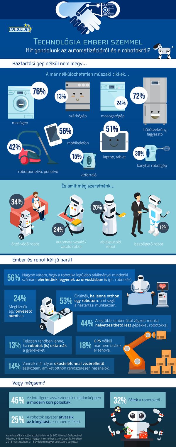 Valószínűleg mindenki emlékszik még az amerikai Jetson család jövőben játszódó történetére, ahol Rosie, a robot segítette a família mindennapjait. Ma még ugyan az űrben nem alapítottunk új kolóniát, de a technológia érezhetően átszőtte egész életünket. Az Euronics friss felméréséből* kiderült, hogy a Veszprém megyeiek nem félnek a robotoktól, és a lakosok többsége várja, hogy a robotika találmányai az orvoslásban is széles körben elérhetőek legyenek. Az önvezető autókban azonban a megyében lakók ötöde bízna meg, de tény, hogy ma már az olyan mindennapos háztartási gépek nélkül, mint a mosógép vagy a hűtőszekrény elvesznénk a világban.