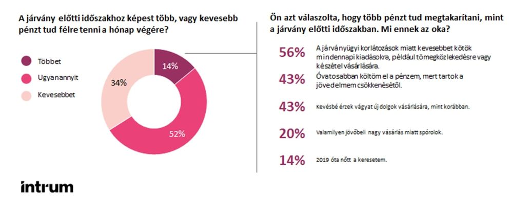 A jövedelmek csökkenése miatt általában egyenesen arányosan csökkennek a megtakarítások is, bár az Intrumnak adott válaszok alapján a legtöbb megkérdezettnek a spórolásnak vagy a pluszmunkának köszönhetően sikerült egyensúlyban maradnia: az európai fogyasztók 52 százaléka azt mondta, a COVID-válság kezdete óta nem változott az az összeg, amit a hónap végére félre tud tenni. 34 százalék a havi megtakarítása csökkenéséről számolt be, 14 százalék viszont több pénzt tud félretenni, mint a válság előtt.