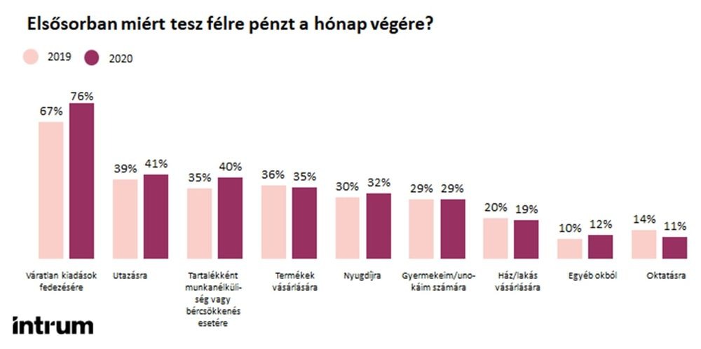 A válság miatt nemcsak a megtakarítások értéke változik, de az is, milyen célra tesznek félre az emberek. Az Intrum felmérése szerint 2019 óta jelentősen (67-ről 76 százalékra) nőtt Európa-szerte azoknak a fogyasztóknak az aránya, akik vésztartalékot gyűjtenek a váratlan kiadások fedezésére. Nem változott azonban jelentősen azoknak az aránya, akik valamilyen konkrét célra spórolnak: enyhén csökkent a lakásra spórolók aránya (20-ról 19 százalékra), nőtt viszont azoknak a száma, akik nyugdíjcélra tesznek félre (30-ról 32 százalékra). Érdekesség, hogy azoknak az aránya csökkent a legjobban, akik oktatási célra tesznek félre pénzt, 2019-hez képest 3 százalékponttal kevesebben gyűjtenek ilyen okból.