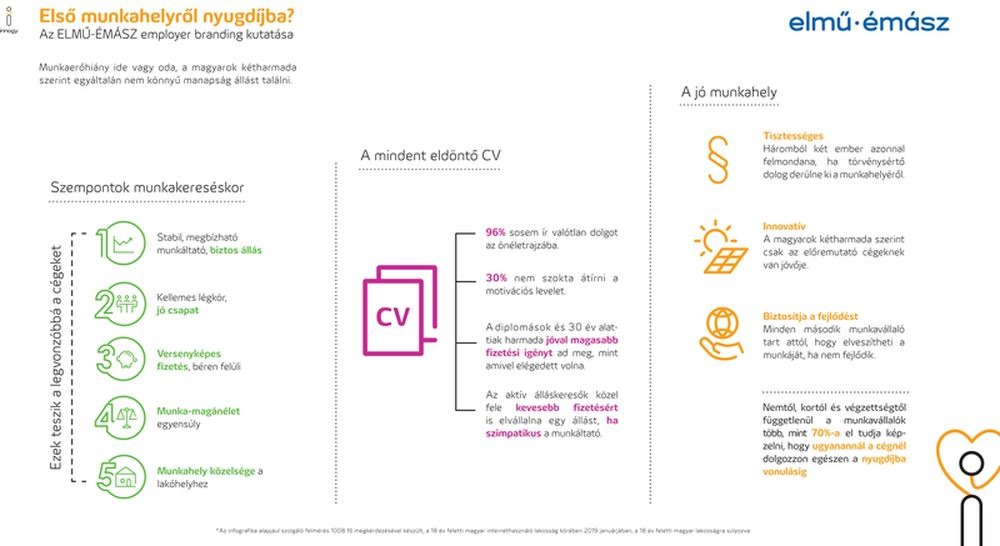 Az ELMŰ-ÉMÁSZ online kutatása arra a kérdésre is kereste a választ, hogy a magyarok számára mik a legfontosabb szempontok munkakereséskor. A stabil állás, a jó csapat és a versenyképes fizetés egyértelmű helyet foglalnak el a toplistán, ezeket követi a munka és a magánélet egyensúlya, a munkahely megközelíthetősége, a rugalmas időbeosztás és a távmunka lehetősége, illetve az emberközeli, családbarát vezetőség.