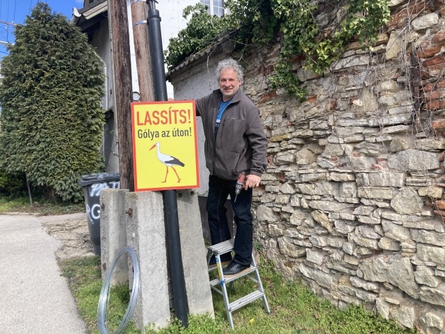 A gólyatáblákat két éve magánszorgalomból helyeztük el a fészek közelében, mert előfordult néhányszor, hogy az úttesten sétálgató vagy az autók szélvédője előtt épp csak átsuhanó gólya meglepetést okozott. Elkészítésüket barátságból és ingyen a Színvonal Dekoráció vállalta. Sajnos, tavaly az egyiket csúnyán megrongálta valaki, így – megint csak ők – újat készítettek, köszönjük nekik! Adamecz Zoltánnak pedig a kihelyezésben nyújtott segítséget, mert ahogyan két éve, úgy most is az első hívó szóra autóba ült, hozott létrát, drótot, szerszámokat. A csodálatos fotók a gólyafészek közelében gyakorta időző Szeghalmi Andrea felvételei.