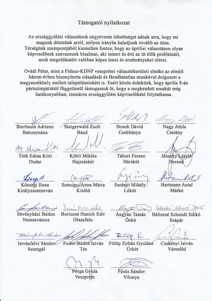 Közösségi oldalán Ovádi Péter, Veszprém megye 1-es számú választókerületének fideszes országgyűlési képviselőjelöltje nyilvánossá tett egy támogatói listát, amelyet a térség 25 polgármestere közül 22 írt alá (mellesleg a többségük 2014-ben függetlenként indult.)