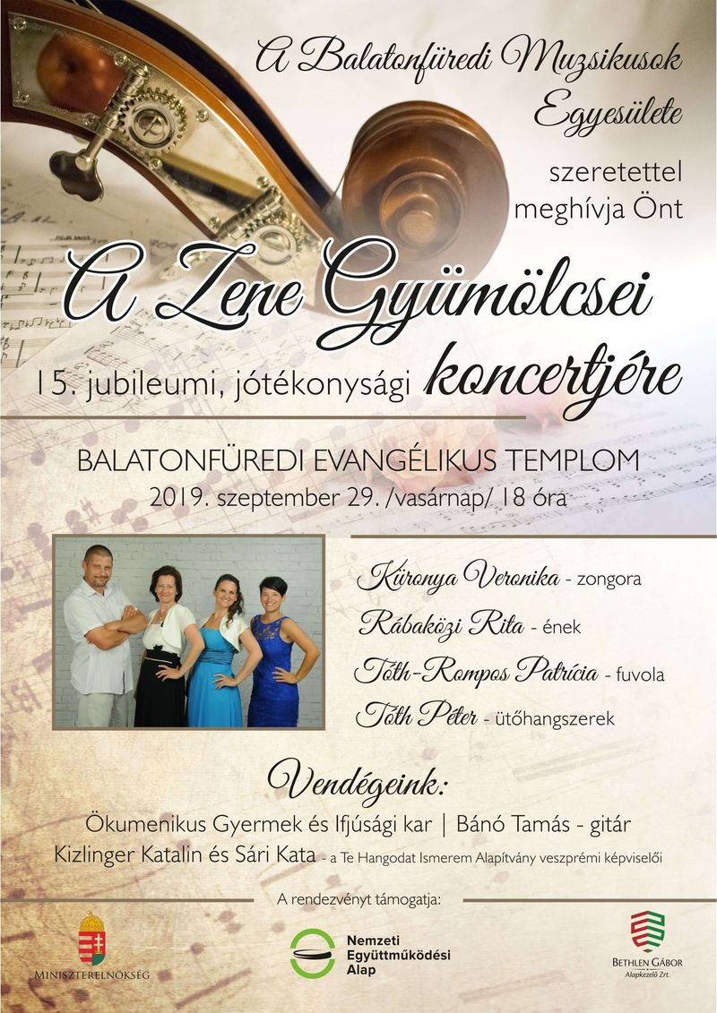 A Te Hangodat Ismerem Alapítvány és a Balatonfüredi Muzsikusok Egyesülete szeptember 28-án, szombaton 18 órakor koncertet ad egy tragikus sorsú balatonfüredi család megsegítésére a helyi evangélikus templomban.