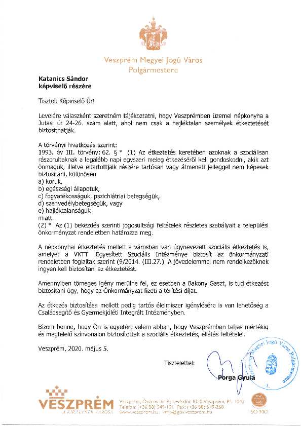 Katanics Sándor képviselő (DK) kérdéseket tett föl Porga Gyulának a szociális étkeztetéssel és a közösségi közlekedéssel kapcsolatban. Előbbiekre már megérkezett a polgármester válasza.