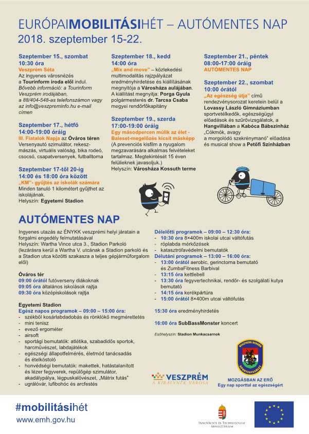 Az Európai Mobilitási Héten, szeptember 15-étől 22-éig több program várja az érdeklődőket. A rendezvény alkalmából Veszprémben szeptember 21-én, pénteken reggel nyolc órától öt óráig tart az autómentes nap. Ebben az időintervallumban a forgalmi engedélyüket felmutatók ingyen utazhatnak a helyi járatokon.