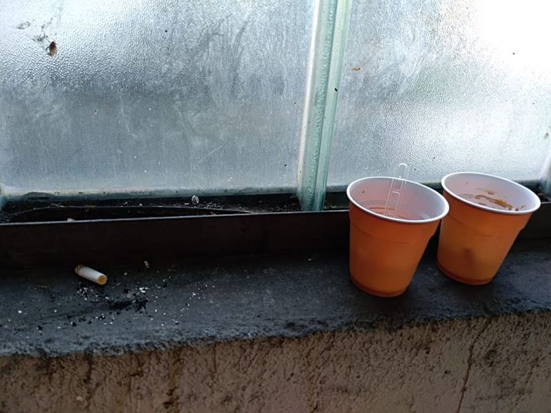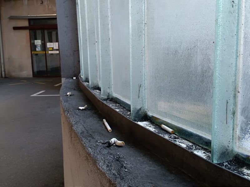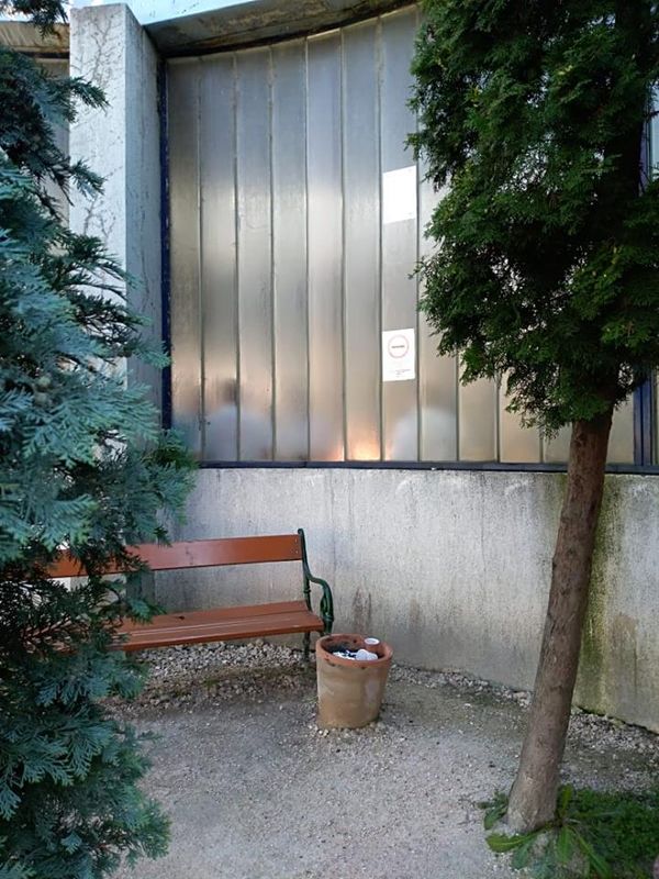 Pad, kosár, fák – de nem itt dohányoznak, hanem a mentőbeállóban. Az üvegfalon keresztül jól látszanak a cigiző árnyak.