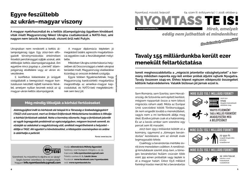A kis újságban, amely innen letölthető, további témákról is olvashatunk, olyanokról, amelyekről nem tudósít a lakájmédia. Nyomtassa és terjessze ön is, hogy minél több emberhez eljussanak az igazi hírek!