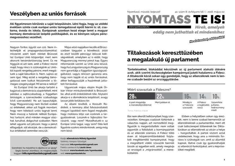 A Nyomtass te is! kezdeményezés csak egyetlen esetben működik: ha elegen leszünk olyanok, akik tényleg nyomtatnak és terjesztik is ezt az újságot. Csatlakozhat kicsiben és nagyban, lehetőségei, ereje szerint. Akkor is sokat tett, ha csak egy-két példányt nyomtat ki és juttat el ismerősökhöz vagy ismeretlenekhez.