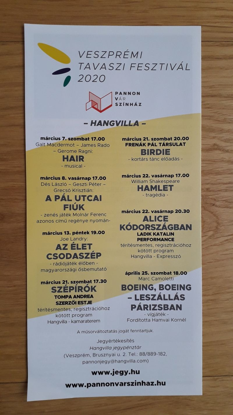 – Saját darabjaink közül a Hairt, a 150. előadáshoz közelítő A Pál utcai fiúkat, A élet csodaszép című élő rádiójátékot, a Hamletet és a Boeing, Boeing – Leszállás Párizsban című vígjátékot láthatja a közönség a Veszprémi Tavaszi Fesztivál keretében – sorolta Vándorfi László, a Pannon Várszínház rendező-igazgatója a mai sajtótájékoztatón. – Az élet csodaszép című darabnak ez a magyarországi ősbemutatója, és a közönség meglesheti a klasszikus rádiójátékok kulisszatitkait: a színpadon születik minden zaj, effektus, ahogy ez régen is történt. Az előadás után a kíváncsiak kipróbálhatják az effektuskészítést, és ismerkedhetnek, beszélgethetnek az előadás szereplőivel.