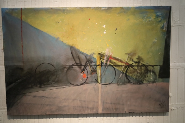 – Vásznain látni árokpartra vetett biciklit, kocsma előtt hagyott bicikliket, falnak támasztott vagy éppen összeütközött bicikliket. De sehol a biciklista. Hová tűnt? Nem fogom ezt a titkot megfejteni, többek között ez a művészet szépsége, hogy mindenki a maga történetét vetítheti bele a képekbe – mondta megnyitóbeszédében Illés Andrea.