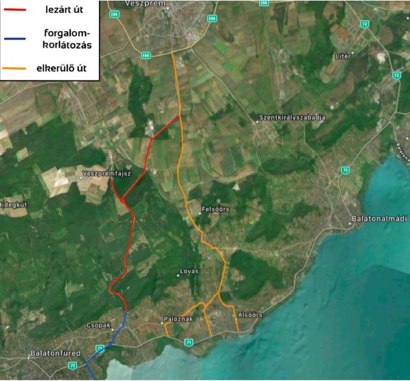 A bekötőpontokon behajtási tilalom lesz érvényben, ezért ebben az időszakban a gépjárműforgalom az alábbi útvonalra terelődik át: Veszprém–73-as út–7219-es út–Felsőörs–Lovas–71-es út.